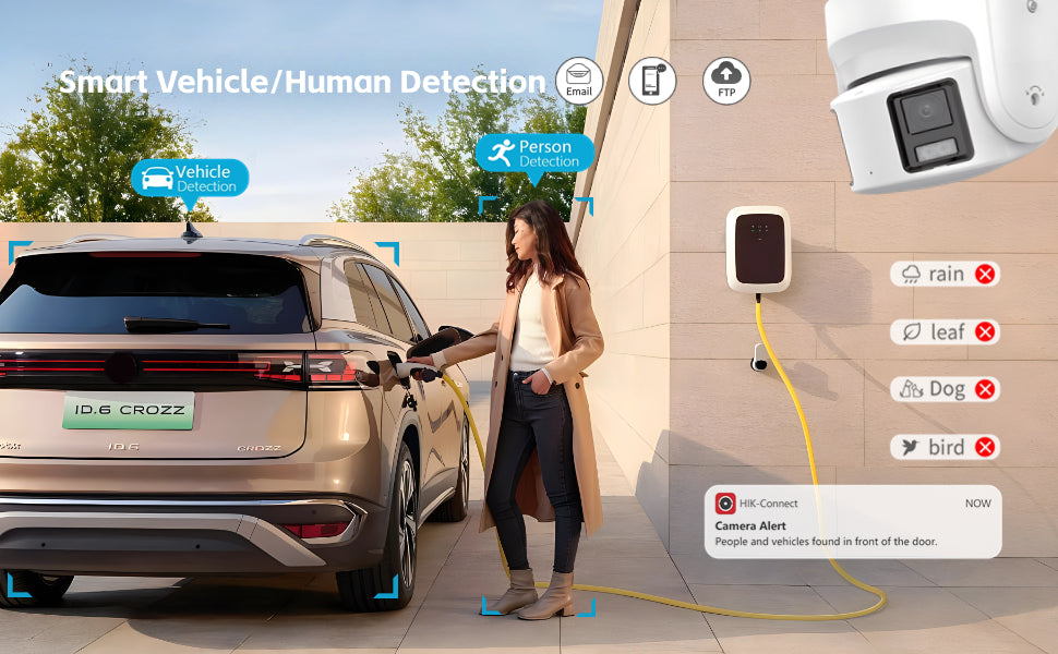 - Analytics include: motion detection (supports human and vehicle target types), alarm input and output, flashing alarm light output, audible alarm output, exception, line crossing detection, intrusion detection, region entrance detection, region exiting detection, and scene change detection