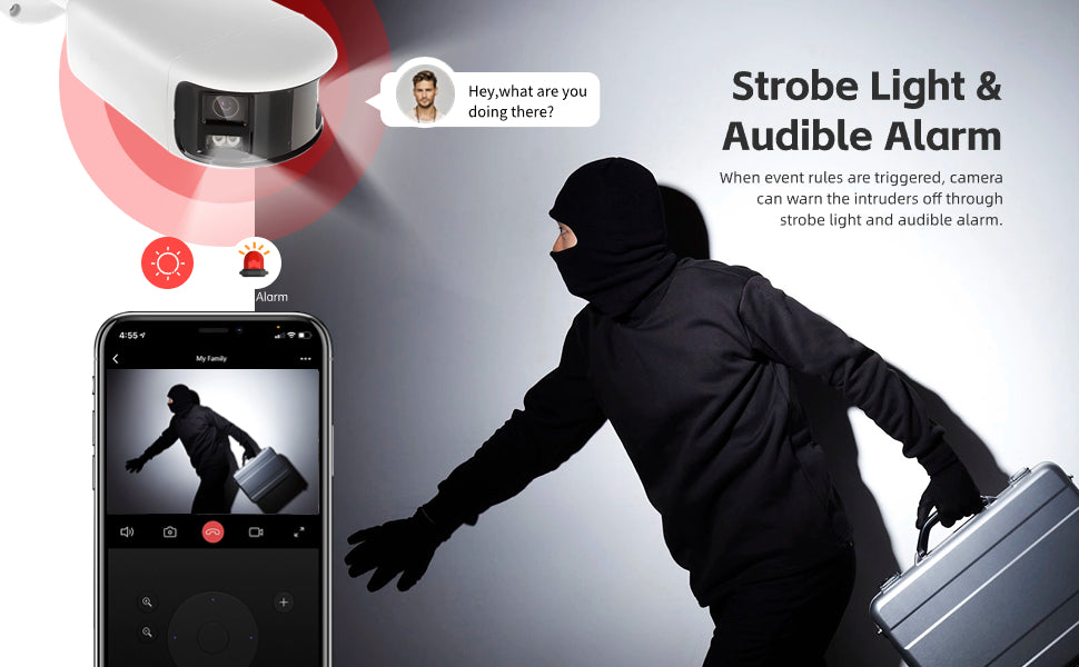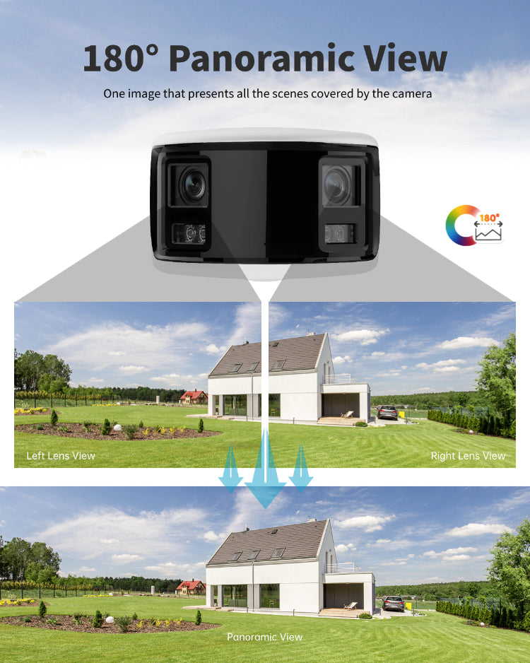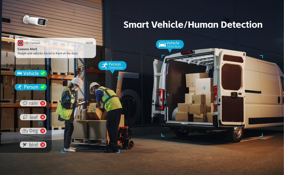 - Analytics include: motion detection (supports human and vehicle targets alarm triggering), alarm I/O, flashing alarm light output, audible alarm output, exception, scene change detection, and perimeter protection (line crossing, intrusion, region entrance/exiting)